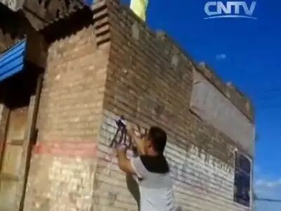 正当检查人员和业主交涉开门检查的时候,业主突然从屋里拿出油漆,准备把“加油”两个字给涂抹掉。